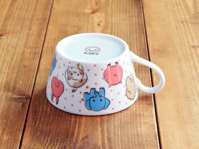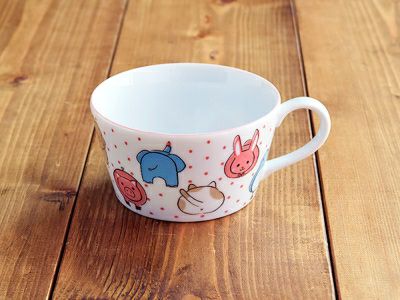 扱いやすい磁器の器に、可愛らしい動物のイラストがプリントされたキッズマグカップ。 イヌ・ネコ・ウサギ・ブタ・トリ・ゾウのイラストがポップに描かれています。お尻を向けている姿はとってもキュート!スープを飲み干せば、内側の底にあるイラストが顔を出します。 これなら小さなお子様も、お父さんお母さんと一緒にお食事が楽しめますね。 スープやお味噌汁のほかにも、サラダや汁気のあるおかずを入れてもOK。 持ち手がしっかりとついているので、お子様でも持ちやすいというのもポイントです。