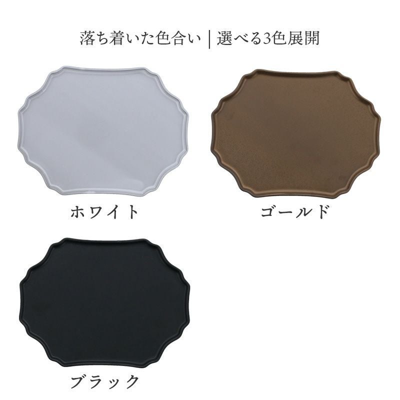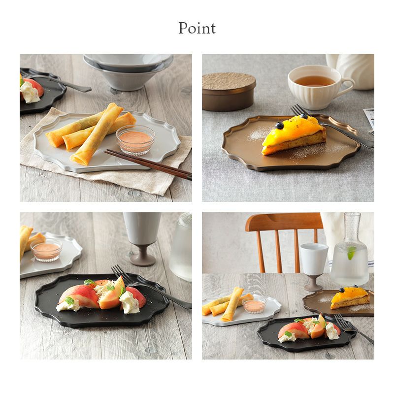 高級感のあるおしゃれなプレート。 雰囲気がぐっと引き締まって、テーブル全体を大人風にコーディネート。 中皿サイズで、取り皿はもちろん、前菜皿や副菜皿に活躍します。 サラダ皿、パン皿、ケーキ皿などデザートプレート等、多用途に使える便利なお皿です。