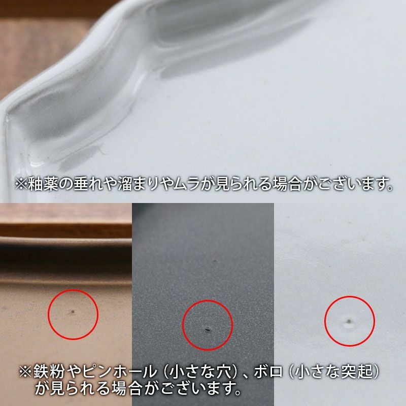 | 注意事項 | ※サイズは全て外寸になります。 ご注意 ※ホワイトはグレー寄りの色味となります。 ※鉄粉やピンホール(小さな穴)、ボロ(小さな突起)、釉薬の垂れや溜まりやムラが見られる場合がございます。 ※製造工程上、裏側の白い跡が見られる場合がございます。 ※ゴールドは食材の油分や皮脂が染み込みやすくなっております。 ※お客様のお使いのモニター設定、お部屋の照明等により実際の商品と色味が異なって見える場合がございます。 ※画像に含まれる小物は使用イメージのために使用しています。 ※不明な点がございましたら、お気軽にお問い合わせ下さい。 |