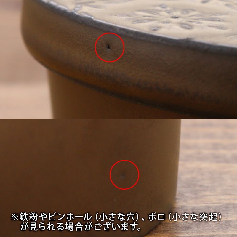 | 注意事項 | ※サイズは全て外寸になります。 ご注意 ※鉄粉やピンホール(小さな穴)、ボロ(小さな突起)、釉薬の垂れや溜まりやムラが見られる場合がございます。 ※多少の傾きがありますが使用上問題ありません。 ※色飛びが見られる場合がございます。 ※お客様のお使いのモニター設定、お部屋の照明等により実際の商品と色味が異なって見える場合がございます。 ※画像に含まれる小物は使用イメージのために使用しています。 ※不明な点がございましたら、お気軽にお問い合わせ下さい。 |