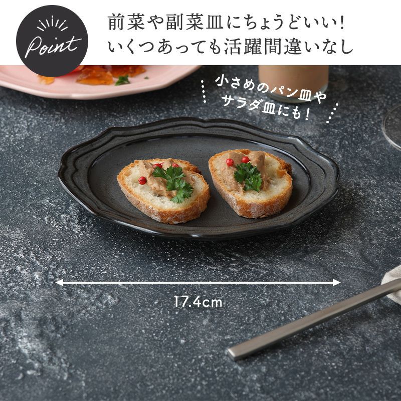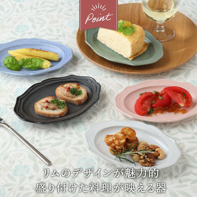 リム部分がデザインされた楕円型のお皿です。 おしゃれな形状で、食材を乗せただけで映える器です。 サラダやデザートなど、盛り付けたお料理を引き立てます。 こちらのお皿は横幅が17cm程度ですが、盛り付ける部分は13.5cm程のためサイズ感的には小皿位になります。 前菜皿やミニケーキ、フルーツ、小さめのパン皿として活躍するサイズです。