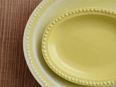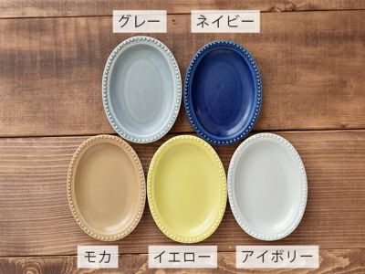 どんな料理もあっという間にカフェ風に盛り付けできる、おしゃれなオーバルプレート。 かわいい縁のドット模様と、食卓を彩るおしゃれなカラーが映えるシリーズです。 SNSでも人気のグレー、写真映えするネイビー、ナチュラルなアイボリー、明るいイエロー、Cafeに似合うモカの5色からお選びいただけます。色違いで組み合わせると賑やかになりますよ! 12cmの小皿は、お菓子などのデザート皿にちょうどいいサイズ。 フルーツ皿、ミニサラダ皿、漬物皿、副菜皿など、ちょっとした一品の盛り付けにも便利。醤油皿、薬味皿、タレ皿としてもお使いいただけます。