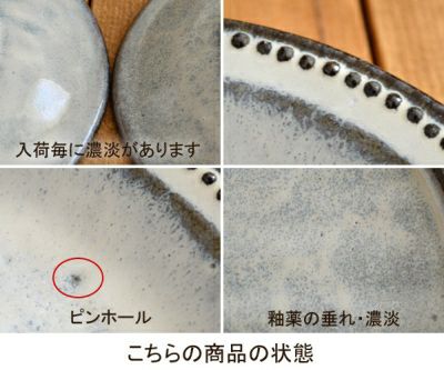 | 注意事項 | ご注意 ※吸水性がございますので、ご使用前に10分程度水に浸していただくと、染み込みが軽減されます。 ※小さな鉄粉、ピンホール(針で刺したような小さな穴)、ボロ(小さな突起)などが見られる場合がございます。 ※釉薬の濃淡や色合いに個体差がございます。 ※多少のガタつきが見られる場合がございます。 ※お客様のお使いのモニター設定、お部屋の照明等により実際の商品と色味が異なって見える場合がございます。 ※不明な点がございましたら、お気軽にお問い合わせ下さい。 |