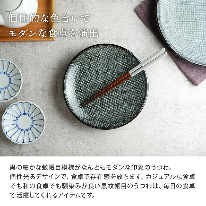 細かいチェック模様のような蚊帳目はモダンな雰囲気で、様々な料理に馴染んでくれます。 こちらは主菜皿、副菜皿、ケーキ皿、サラダ皿、パン皿、大きめの取り皿など多用途に使える便利な中皿サイズ。 日常使いはもちろん、料理を品よく見せてくれるので、おもてなし食器としてもおすすめです。