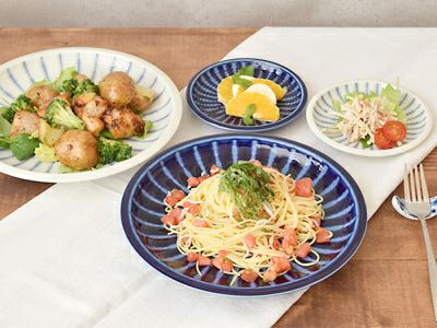 白と青のコントラストが美しい、十草模様のプレート。 食卓を爽やかにコーディネートできる和食器です。 カラーはどんな料理にも合わせやすい白と、一枚でも迫力のある青の2色。 縁の立ち上がりの先に厚みがあるのが特徴のお皿で、食卓に並べると存在感があります。 こちらは25cmサイズの大皿。 パスタ皿にぴったりな大きさです。少し深さがあるので、カレー皿にも使えます。 その他、おかずの盛り皿やサラダ皿、ワンプレートランチなどご家庭で大活躍してくれそう。