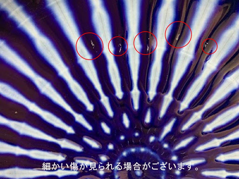 | 注意事項 | ※細かい気泡跡が見られる場合がございます。※模様の出方に個体差がございます。 ※釉薬の垂れ跡が見られます。 ※お客様のお使いのモニター設定、お部屋の照明等により実際の商品と色味が異なって見える場合がございます。 ※画像に含まれる小物は使用イメージのために使用しています。 |
