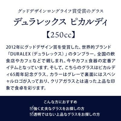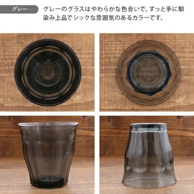 カフェの定番グラス デュラレックス・ビカルディ。 カラーはシックで落ち着きのあるグレー。 クリアなグラスにはない特別な雰囲気があって、食卓をワンランクアップしてくれます。 お食事時のお茶やお水のカップとしてや、ティータイムの紅茶やコーヒーのグラスなど様々なシーンで活用いただけます。 全面強化ガラスで電子レンジ・食洗機も使用できるので普段使いのガラス食器としておすすめ。