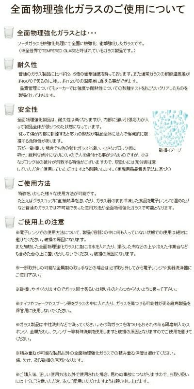 | 注意事項 | ※電子レンジに使用できますが、傷などがあると破損に繋がりますので、十分にご注意ください。※耐熱ガラスではございません。 ※サイズは全て外寸になります。 ご注意 ※製造工程上で細かい傷、歪み、気泡、シワ跡、若干のサイズ違い等がみられます。こちらは不良品ではございませんので返品対象外となります。 ※急激な温度変化は破損の原因となりますのでご注意ください。 ※研磨剤入りのスポンジ。金属製たわし、クレンザー等を使用しないでください。 ※金属製のカトラリーなどをご使用の際は傷がつかないようご注意ください。 ※商品の製造上シワが寄り、溝のような跡が見られる場合がございます。 ※お客様のお使いのモニター設定、お部屋の照明等により実際の商品と色味が異なって見える場合がございます。 ※画像に含まれる小物は使用イメージのために使用しています。 |