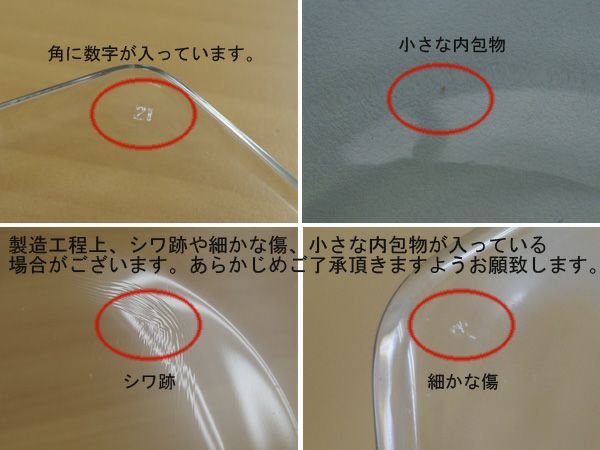 | 注意事項 | ※サイズは全て外寸になります。 ※サイズ・重さなどは商品により誤差があります。 ご注意 ※この商品は小さな傷・気泡・シワ跡・内包物などが 製造工程で入ることがございます。 ※底面に刻印されたロット番号は一つ一つ異なる数字になります。 ※こちらは全面物理強化ガラスのため、約120度の温度差に耐える事ができますが、急冷は避けてください。 ※画像に含まれる小物は使用イメージのために使用しています。 ※不明な点がございましたら、お気軽にお問い合わせ下さい。 |