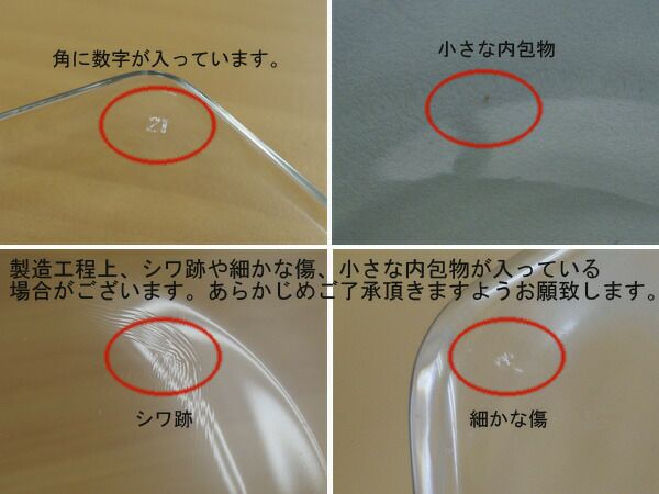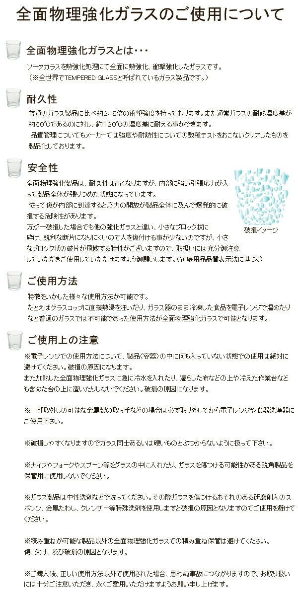 | 注意事項 | ※サイズは全て外寸になります。 ※サイズ・重さなどは商品により誤差があります。 ご注意 ※製造工程で小さな傷・気泡・シワ跡・内包物などが入ることがございますが不良品ではございませんので、予めご了承下さいませ。 ※底面に一つ一つ異なるロット番号が刻印されています。 ※全面物理強化ガラスのため約120度の温度差に耐える事ができますが、加熱したガラスに急に冷水を入れたり、濡らした布等の上に置く事は避けてください。 ※お使いのモニター設定、照明等により実際の商品と色味が異なって見える場合がございます。 ※不明な点がございましたら、お気軽にお問い合わせ下さい。 |