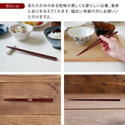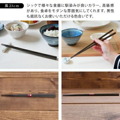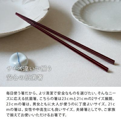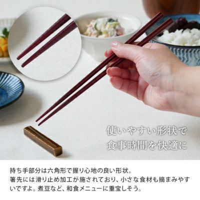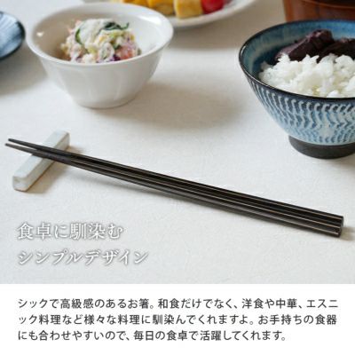 普段使いにも便利な抗菌加工・食洗機対応の木製のお箸。 深みのあるシックな色合いは高級感があり、食卓をワンランクアップしてくれます。 洋食・中華・エスニックなど様々な料理や器にも合わせやすいシンプルデザイン。 色違いで揃えて、おしゃれな夫婦箸としてお使いいただけます。