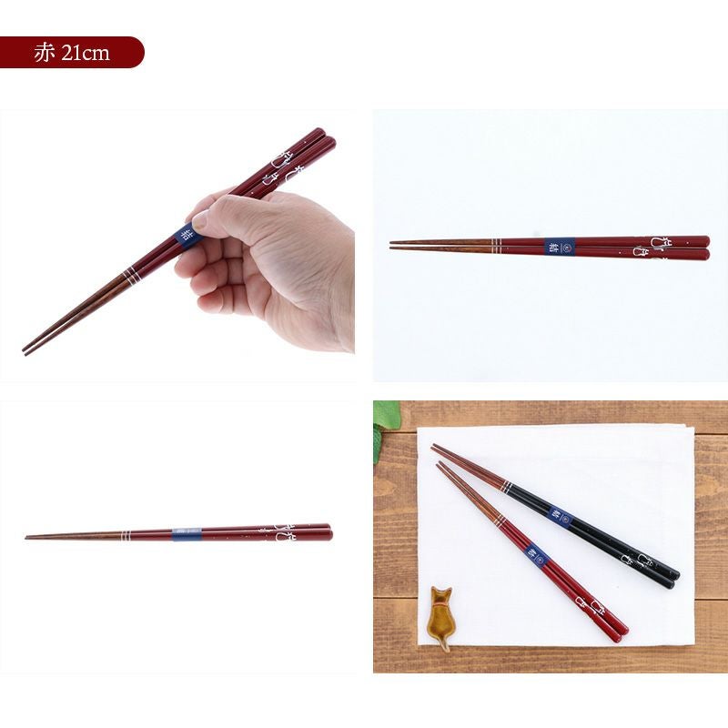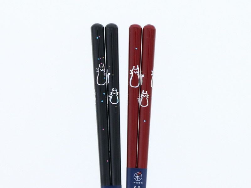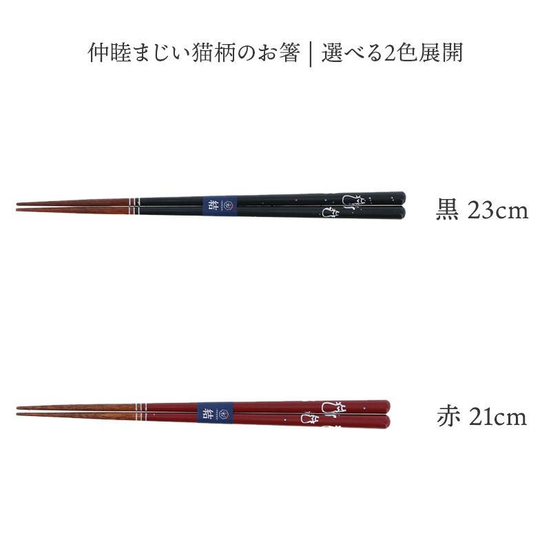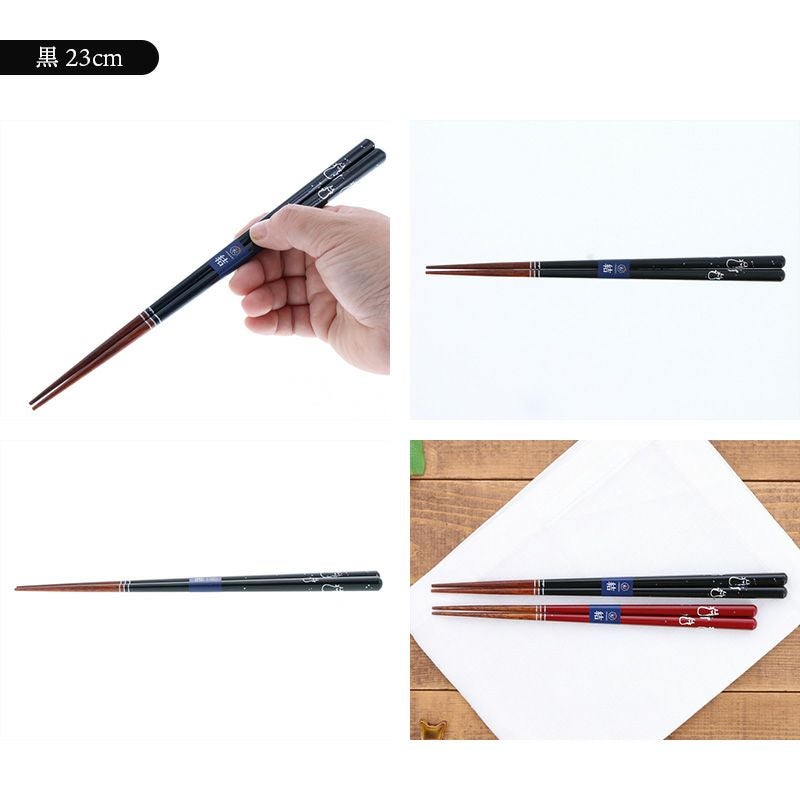 仲睦まじいにゃんこが施された天然木のお箸。 黒と赤の配色で柄がしっかりと引き立ちますよ。 男女で使いやすい長さなので、カップルやご夫婦でお使いいただけます。 贈り物にもおすすめの一品です。