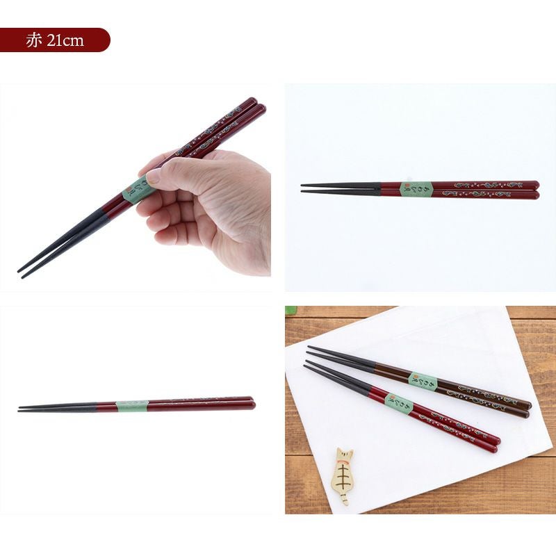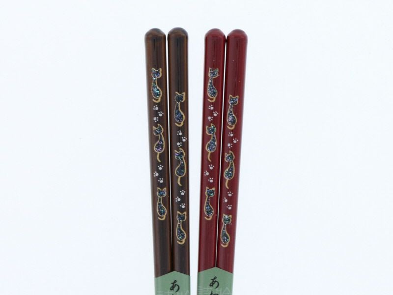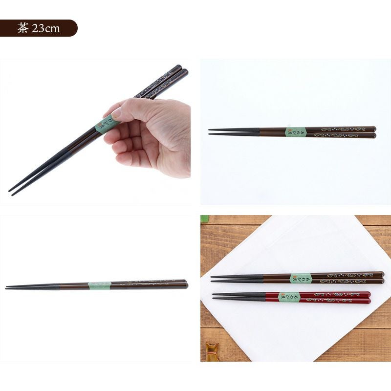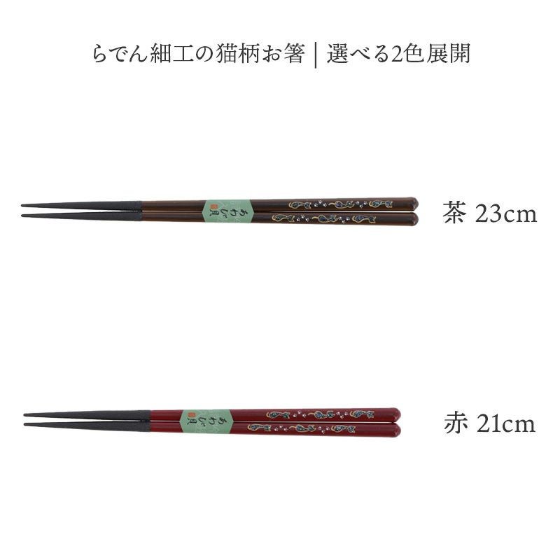 深みある色合いに、猫柄デザインがかわいい箸。 シックな茶の箸は23cmで男性にも使いやすく、鮮やかな赤の箸は21cmで女性でも持ちやすい長さです。 華やかならでん細工は特別感もあり、お祝いの席やお正月など特別な日のためのお箸としても。 箸先には滑り止め加工が施されていて、食洗器にも対応していますので日常使いのお箸としてもおすすめです。