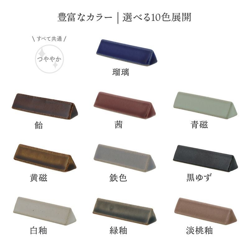 深みのある和の色合いが魅力の陶器製箸置き「KURABI」。 5cmの程よいサイズで、箸を安定させ食卓を美しく演出します。 釉薬の風合いが一つひとつ異なり、表情豊かな仕上がりが楽しめます。 全10色展開で、同シリーズの箸と揃えれば統一感のある食卓になりますよ♪