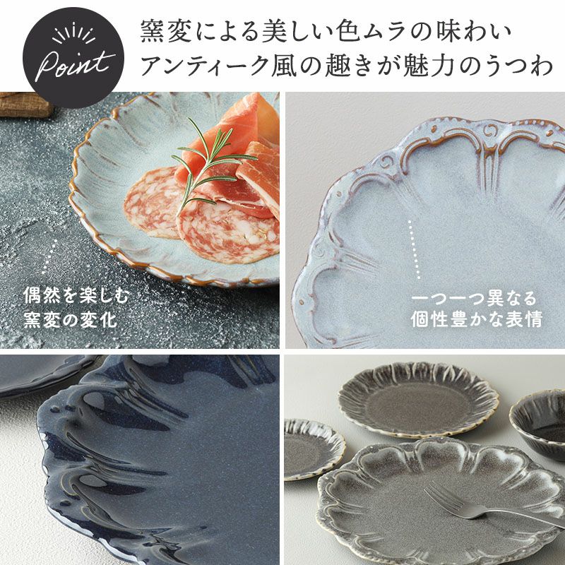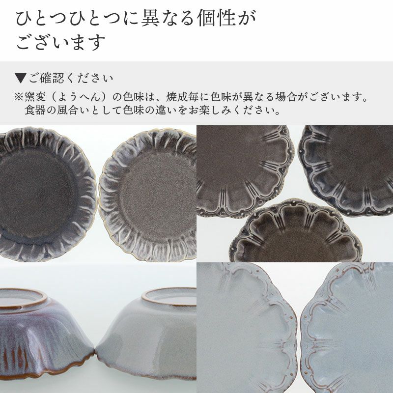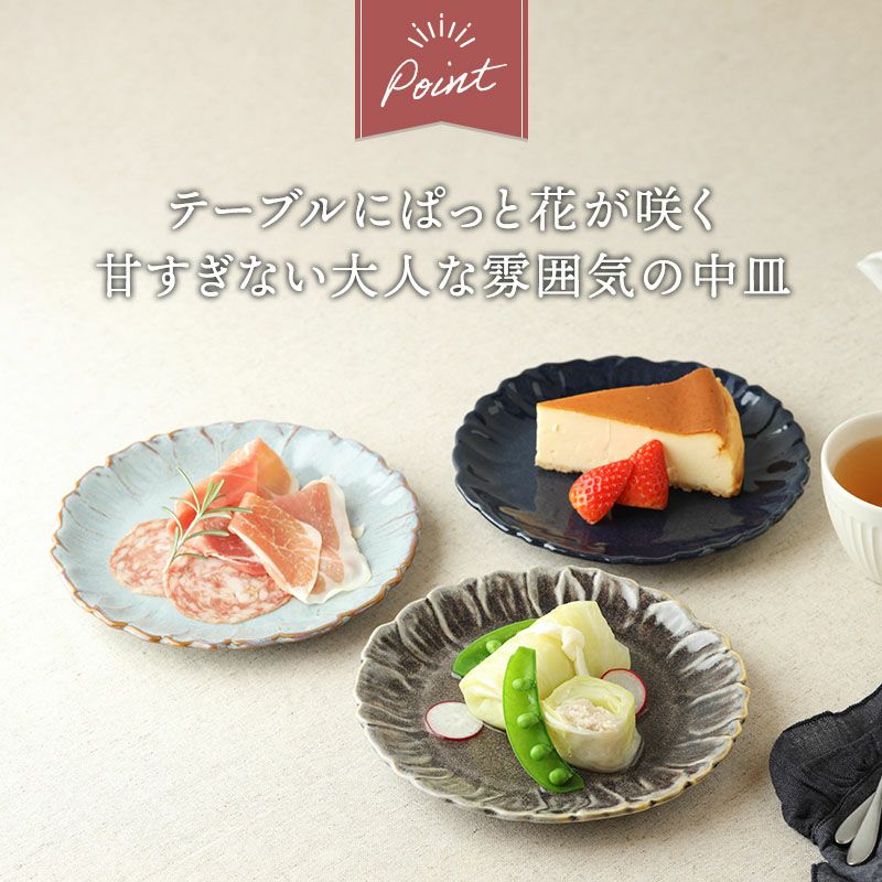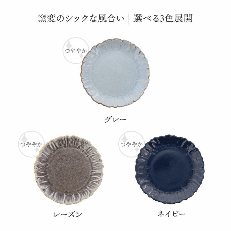 洗練されたくすみ系カラーとお花のようなリムがおしゃれな和食器です。 約18cmの中皿はケーキ皿、パン皿、取り皿にぴったり! 上品なカラー食器なので、普段使いはもちろんおもてなしの用にも◎ 複数枚取り揃えておくととても重宝しますよ。