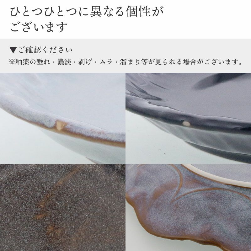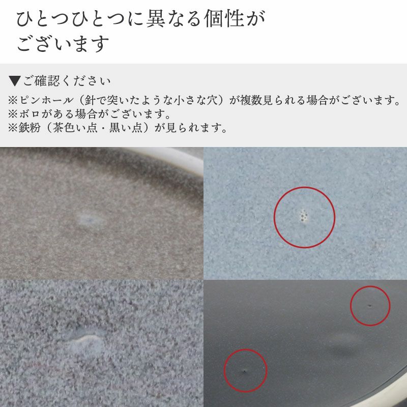 | 注意事項 | ※サイズは全て外寸になります。 ※サイズ・重さなどは商品により誤差があります。 ご注意 ※ピンホール(針で突いたような小さな穴)が複数見られる場合がございます。 ※ボロがある場合がございます。 ※鉄粉(茶色い点・黒い点)が見られます。 ※釉薬の垂れ・濃淡・剥げ・ムラ・溜まり等が見られる場合がございます。 ※窯変(ようへん)の色味は、焼成毎に色味が異なる場合がございます。食器の風合いとして色味の違いをお楽しみください。 ※お客様のお使いのモニター設定、お部屋の照明等により実際の商品と色味が異なって見える場合がございます。 ※画像に含まれる小物は使用イメージのために使用しています。 ※不明な点がございましたら、お気軽にお問い合わせ下さい。 |