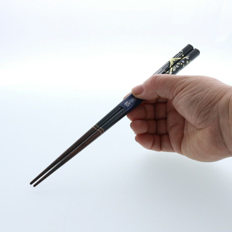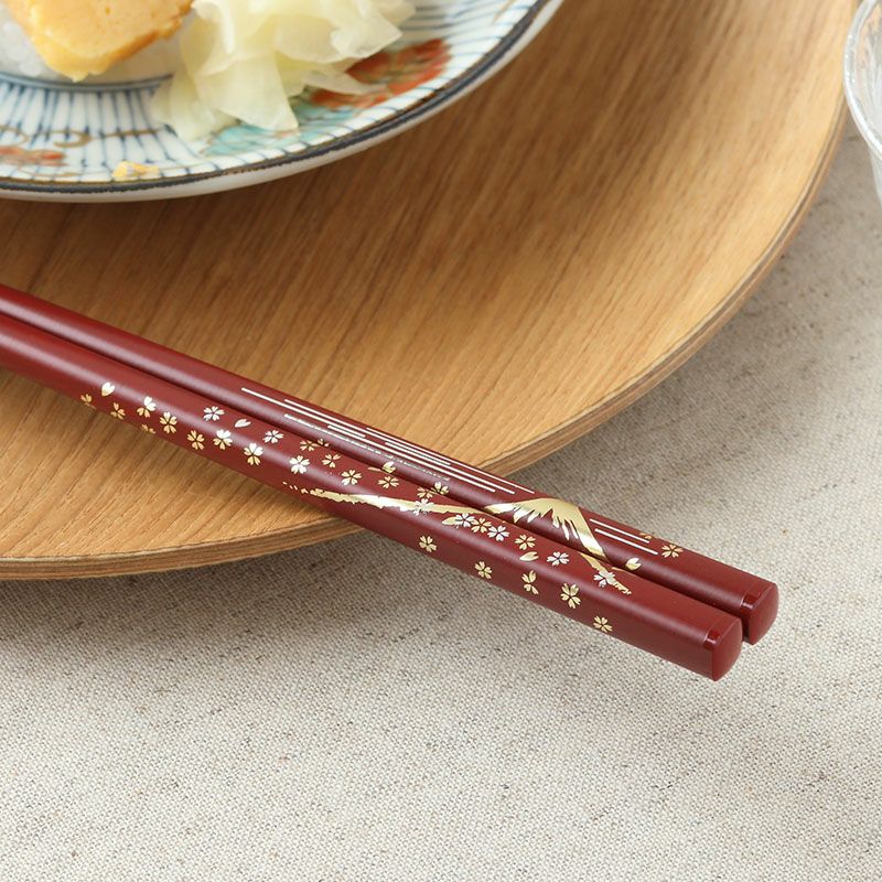 使いやすさを追求した23cmの天然木箸は、男女問わず使用できるサイズです。 しっかりとした握りやすさがあり、大きな手の人にも持ちやすく、深い皿や鍋からも食材を取りやすいのが特徴です。 食洗機対応で、滑り止め加工も施されており、安心して毎日使える一品です。 金彩富士のデザインが食卓を華やかに彩ります。
