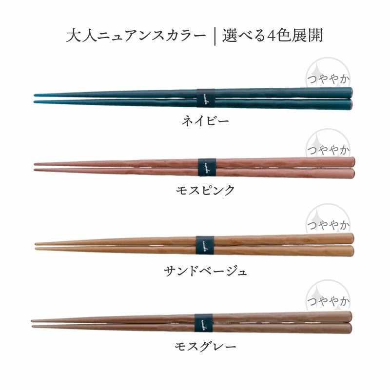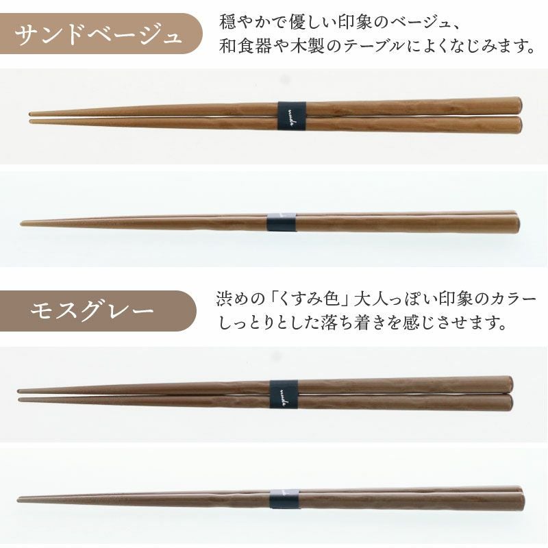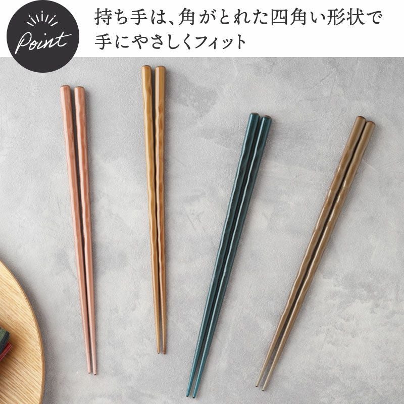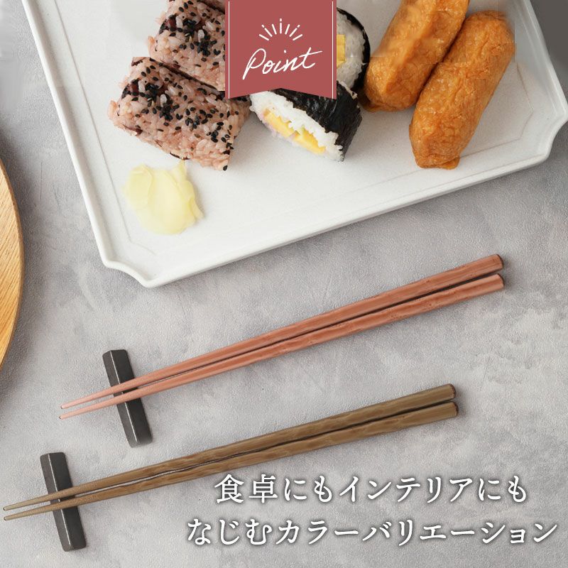 ニュアンスカラーがおしゃれなお箸です。 箸先は細すぎず、太すぎずで、程よい太さで男女問わず使用できるサイズ。 落ち着いた雰囲気で、来客用としても活躍してくれるデザインです。 食洗機使用OKですので、おしゃれだけでなく実用性も兼ね備えたアイテムです。