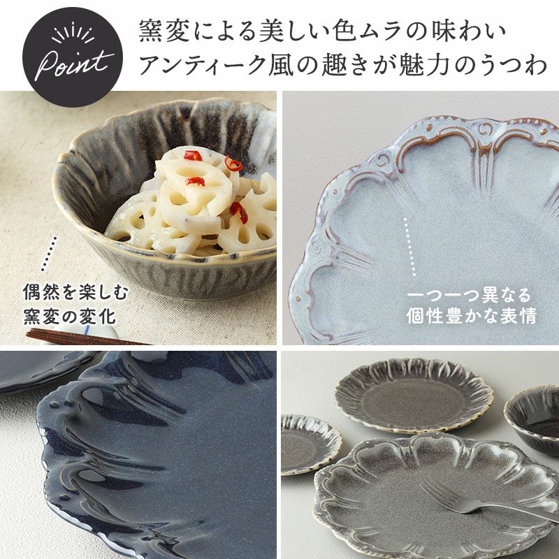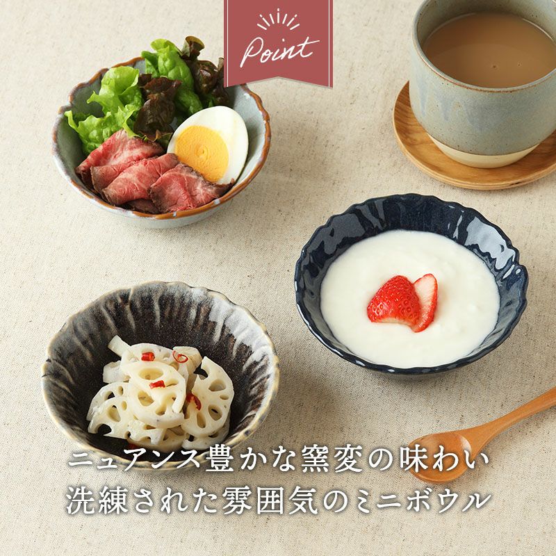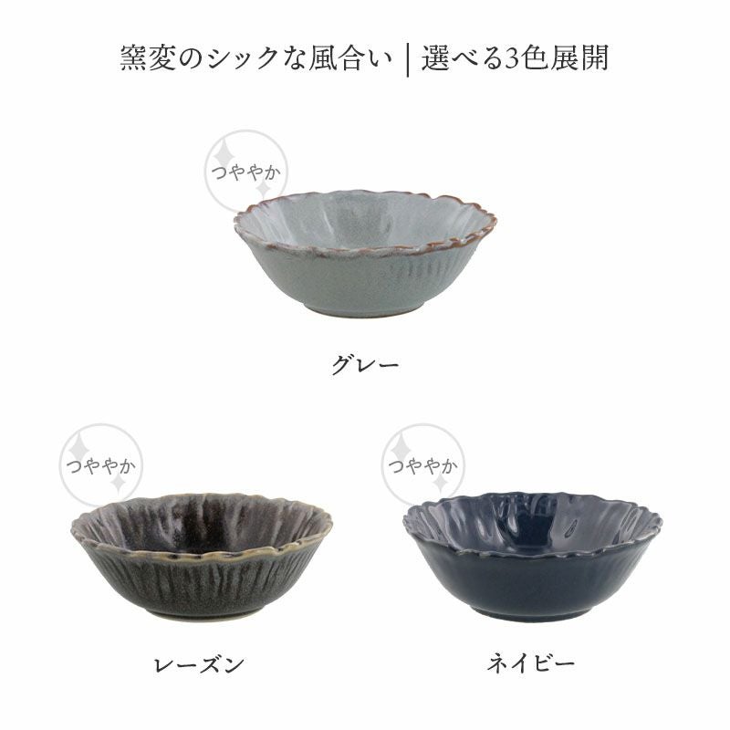 洗練されたくすみ系カラーとお花のような縁がおしゃれな和食器です。 約215ccの小鉢はサラダボウルや煮物を盛りつける小鉢としてはもちろん、ヨーグルトボウルなどのデザートカップ、スープボウルや茶碗蒸しとしても活躍します。 上品なカラー食器なので、普段使いはもちろんおもてなしの用にも◎ 複数枚取り揃えておくととても重宝しますよ。