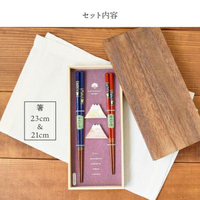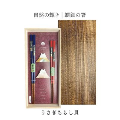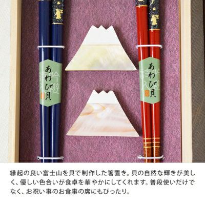 空を見上げるうさぎの箸と縁起物の富士山の箸置きは上品さの中に可愛らしさもあるギフトセットです。 箸置きは貝の自然な輝きが美しく、お箸と一緒にテーブルを華やかに演出してくれます。 趣のある焼桐箱に入った上品で美しいギフトは大切な方への贈り物におすすめです。 食洗機・乾燥機も使用OKですので、デザイン性だけでなく実用性も兼ね備えたアイテムです。 セット内容 ・箸 ×2 ・箸置き ×2 合計4点セット