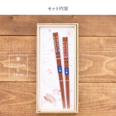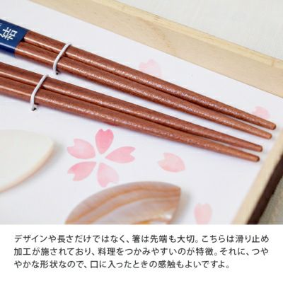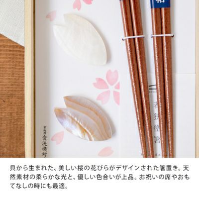 花模様の箸と桜の花びらをモチーフにした箸置きのギフトセットです。 桜をイメージしたギフトは桜の季節はもちろん、普段の和の食卓にも華やかを添えてくれます。 箸置きは貝の自然な輝きが美しく、お箸によく合います。 趣のある焼桐箱に入った上品で美しいギフトは大切な方への贈り物におすすめです。 食洗機・乾燥機も使用OKですので、デザイン性だけでなく実用性も兼ね備えたアイテムです。