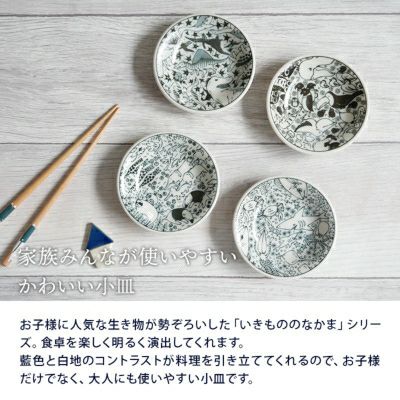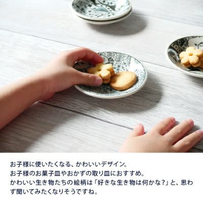 楽しく食事ができるような、お子様に人気の生き物たちのお皿です。 プレート全体に描かれた絵柄は大人も子供も使えるおしゃれなデザイン。 サイズは小皿と豆皿の中間サイズでおつまみ皿、醤油皿、菓子皿、フルーツ皿をはじめ、お子様の取り皿としてもおすすめ。