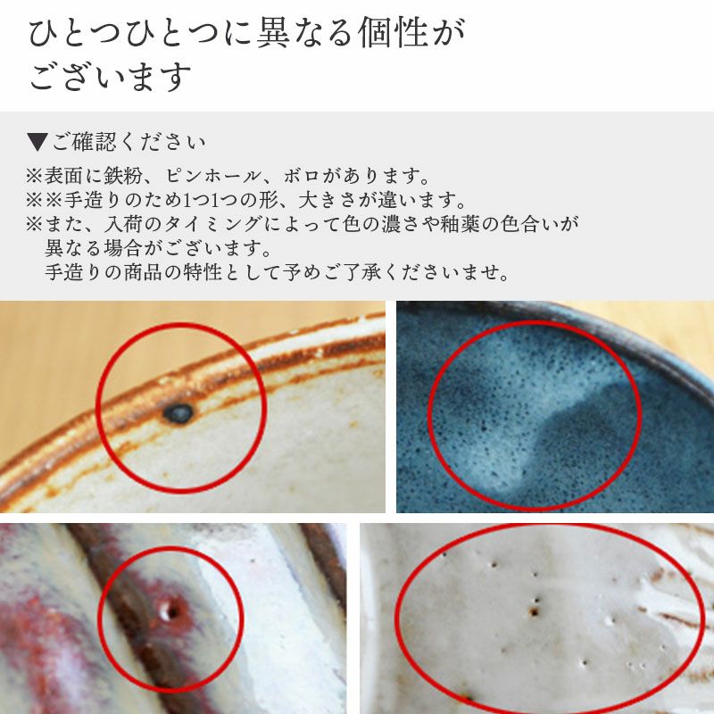 | 注意事項 | ※表面に鉄粉やボロ、ピンホールがございます。 ※手造りのため1つ1つの形、大きさが違います。また、入荷のタイミングによって色の濃さや釉薬の色合いが異なる場合がございます。 手造りの商品の特性として予めご了承くださいませ。 ※お使いのモニター設定、照明等により実際の商品と色味が異なって見える場合がございます。 ご不明な点がございましたらお気軽にお問い合わせ下さい。 |