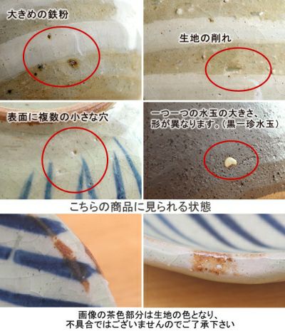 | 注意事項 | ※サイズは全て外寸になります。 ※手造りの為形、模様、大きさに個体差があります。また釉薬のムラやタレ、ボロ、ピンホールがございます。 ※うっすらとオレンジ色の模様が浮かび上がる事がございますが土物ならではの赤土の色でございます。 ※こちらの商品はメーカー都合により、入荷時期が不定期となっており数か月以上入荷がない場合もございます。 ※水玉模様に地が出ていたり、凹凸がある場合がございます。こちらは不良ではございません。 ※お客様のお使いのモニター設定、お部屋の照明等により実際の商品と色味が異なって見える場合がございます。 商品の詳細や画像にご不明な点がございましたら、お気軽にお問い合わせくださいませ。 |