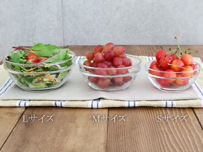 テーブルに並べるだけで、おしゃれなカフェ風になるガラスボウル。 スタックできるので収納性が高く、同じサイズをいくつか揃えたいときに便利。キッチンスペースも有効活用できます。 こちらのLサイズは、サラダボウルやティラミスなどのデザートボウルにおすすめ。 生地を混ぜたり材料を和えるための調理用ボールとして使っていただくこともできます。