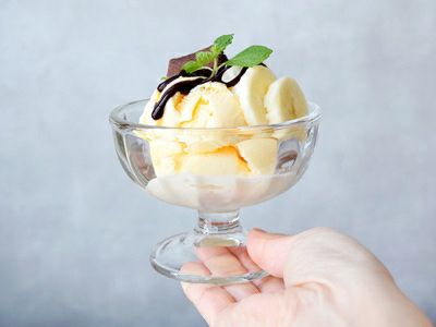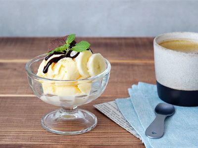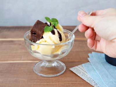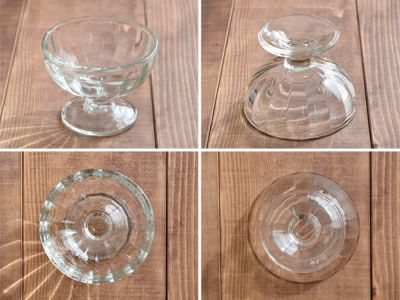 いつものアイスクリームやデザートに高台付きガラス食器はいかがですか?こちらは縦縞模様入りの、ぽってりと厚みのあるガラスカップです。高級感をプラスし、お店のようなアイスクリームが楽しめますよ♪