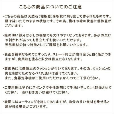 | 注意事項 | ※天然の石材を使用しておりますため、商品の重さや厚みに個体差があります。記載の重さより100g以上重さが異なる場合がありますが、こちらはメーカー正規品として出荷しておりますので予めご了承下さいませ。※天然素材につき、商品毎に表面の模様と縁の欠け具合、サイズに個体差がございます。 ※表面が完全な平面になっていないものがございます。多少のヘコミや盛り上がりにつきましては予めご了承下さいませ。 ※ガタツキが見られる場合がございます。 ※少しの衝撃で破損しやすくなっております。性質上小さなかけらや粉が出ることがございます。お取り扱いにはください。 ※コーティングをしてありますが、鋭利なもので擦ると白く傷がつきます。 ※画像に含まれる、お皿の上の食器やカトラリー等の小物は使用イメージのために使用しています。 |