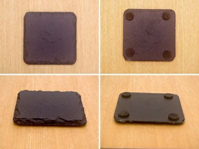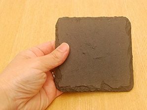 スレートとは天然石(粘板岩)を板状に切り出して作られたコースターです。 裏面には傷防止のクッションが貼ってあります。 縁は砕いたそのままの状態で、天然素材ならではの無骨な質感が魅力です。 食卓の上での存在感は抜群で、大人のかっこいい演出が出来ます。 こちらは正方形のコースター。ロックグラスやビールグラスと一緒に使うと大人のお酒の時間を盛り上げてくれます。マグカップやコップにもどうぞ。