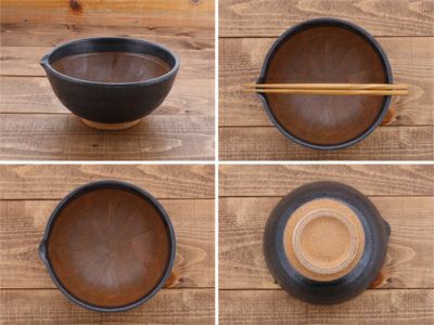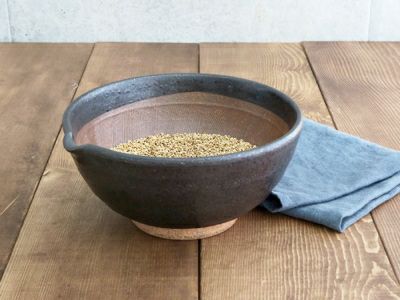 ゴマもとろろもたっぷり擦れる、大鉢サイズのすり鉢です。 和の趣が感じられる黒結晶の色合いが魅力的。 和え物を作れば、家族分のおかずが入った副菜鉢、ラーメンの麺鉢、うどんのどんぶり、サラダボウルなど多用途にお使いいただけます。 ゴマなどを移す際に、こぼれない片口設計なので擂鉢の扱いもラクラク。 摺りたてのゴマの香りはとても良いものですよね。一家に一つは欲しいすり鉢です。