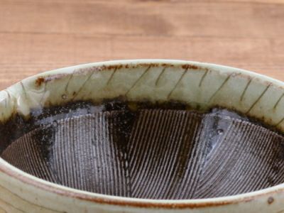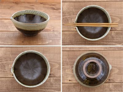 家族の分のゴマもまとめて擦れる大鉢サイズの擂り鉢。 淡い緑とアメ色のコントラストがぱっと目を惹く、和食器らしい風情のあるデザインです。 胡麻をすった後に食材を和えれば、一品料理の副菜鉢やサラダボウルになります。おしゃれなのでそのまま食卓に並べられるのがポイント。 ゴマなどを移す際に、こぼれない片口設計なので擂鉢の扱いもラクラク。 摺りたてのゴマの香りはとても良いものですよね。一家に一つは欲しいすり鉢です。