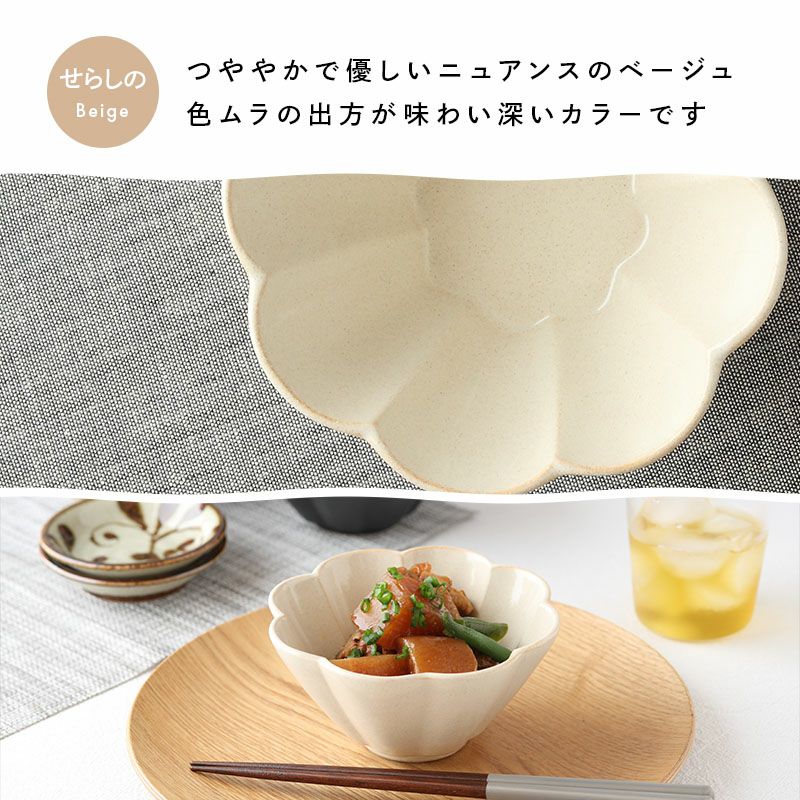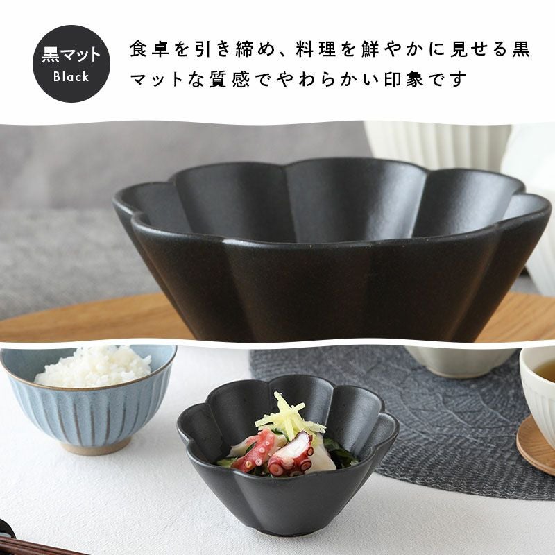 食卓に並べれば、まるでお花が咲いたかのように、華やかになる小鉢。 和え物やお浸し、ちょっとした一品料理を盛りつける他に、サラダボウルやスープボウルとして使ってもOK。 ヨーグルトボウルやシリアルボウルなど、和洋中問わず使えます。あんみつなど和のデザートにも良く似合いますよ。 炊き込みご飯などを盛って、お茶碗の代わりに使っても可愛らしい器です。 カラーは定番の「白備前」と「黒マット」に加え、優しい色味の「せらしの」の3色。組み合わせも楽しめます。
