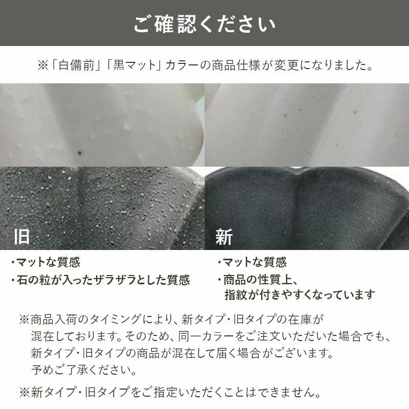 | 注意事項 | ※サイズは全て外寸です。 ※「白備前」「黒マット」カラーの商品仕様が変更になりました。 新タイプ:石の粒&ザラザラ無し・マットな質感・商品の性質上指紋が付きやすい商品です。 ※新タイプ/旧タイプをご指定いただくことはできません。 ご注意 ※お客様のお使いのモニター設定、お部屋の照明等により実際の商品と色味が異なって見える場合がございます。 ※画像に含まれる小物は使用イメージです。 |