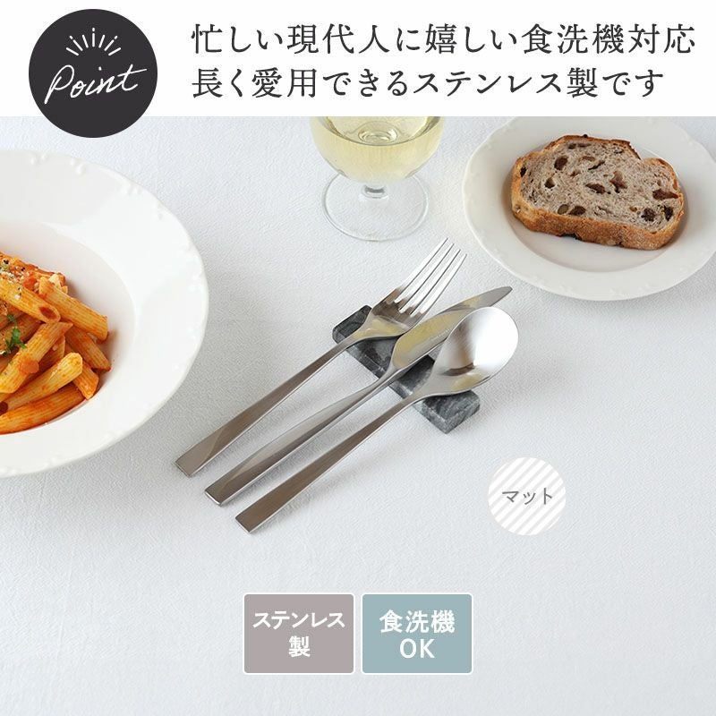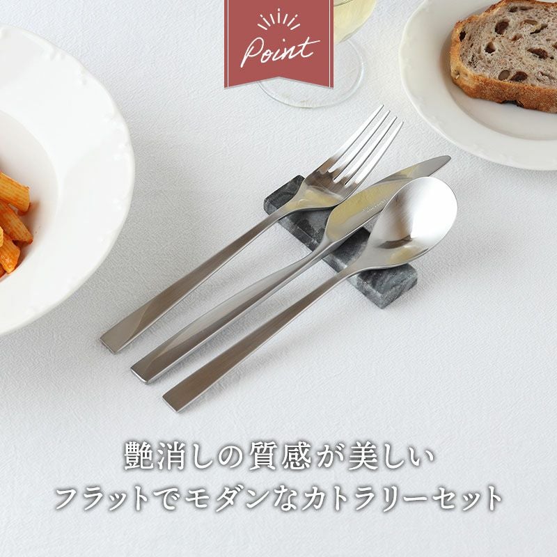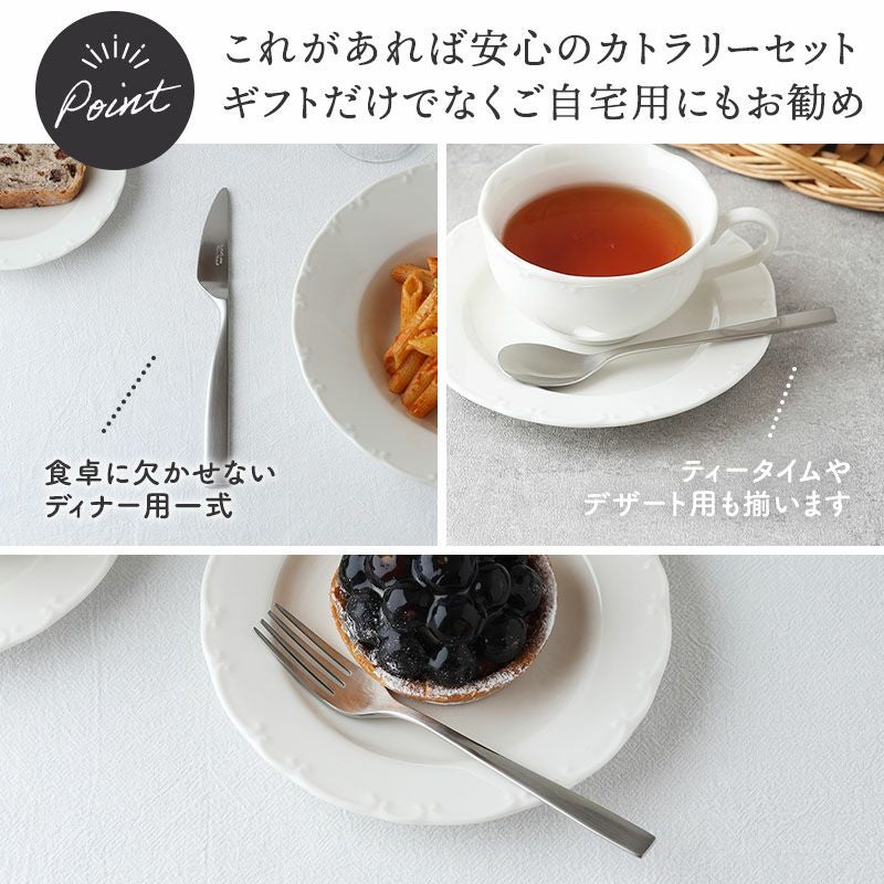 | セット内容 | 箱サイズ/24.8×14.5×高さ3.5cm セット内容/ディナーナイフ×2:20.7cm ディナースプーン×2:18.4cm ディナーフォーク×2:19.4cm ティースプーン×2:13.8cm ケーキフォーク×2:14.5cm 箱入り重さ/約517g |