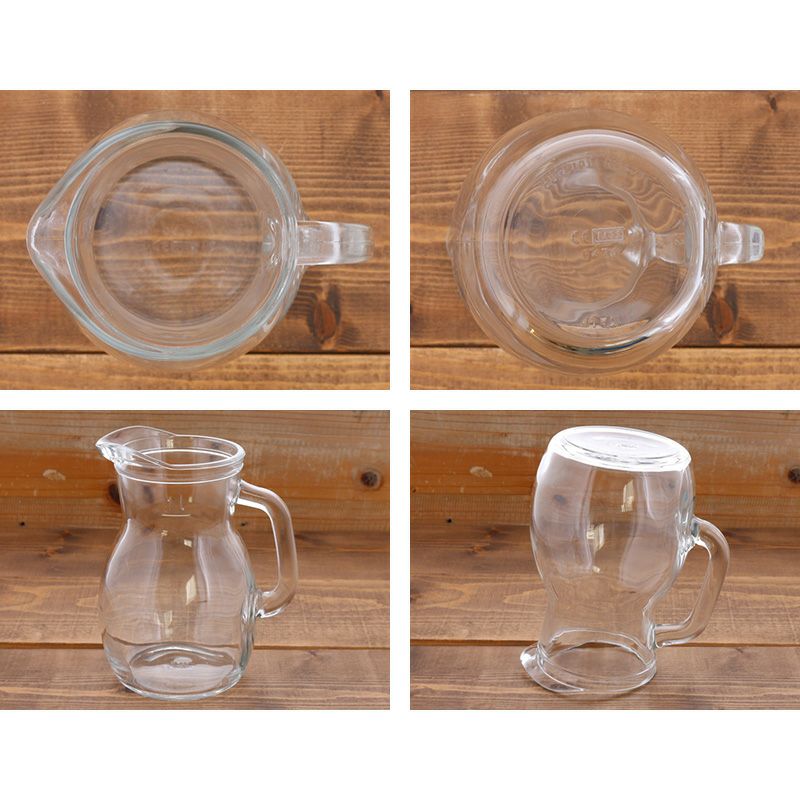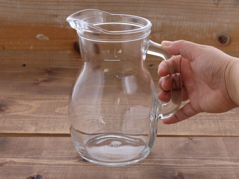 ヨーロッパのカフェやレストランでは定番のガラス製水差し。 肉厚なガラスで持ちやすく、注ぎやすいのが特徴です。 容量は約1リットルの、たっぷりサイズ。 お水以外にもジュースやワインを入れても素敵ですよ。 食洗機対応なので普段使いや業務用にもおすすめ。